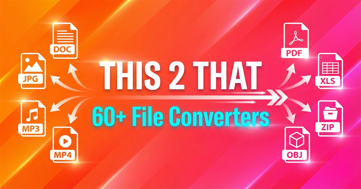 60+ conversions across images (PNG, JPG, WEBP, SVG, HEIC, BMP, ICO), documents (PDF, DOCX, HTML, Markdown, Excel), audio (MP3, WAV, M4A), video (MP4, MOV, WEBM), and data (CSV, JSON, XML, YAML, Base64, TSV).